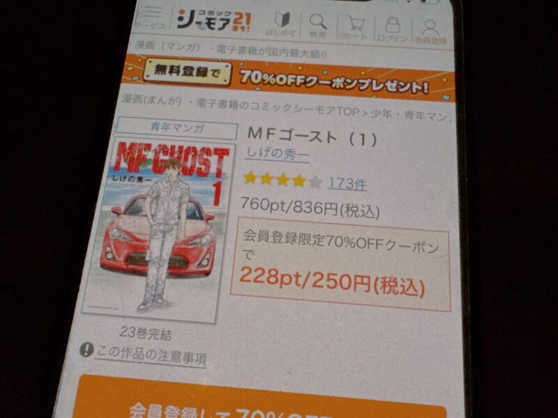 たとえばMFゴースト1巻(税込836円)を購入する場合、クーポン利用で251円(税込)で購入できます。
