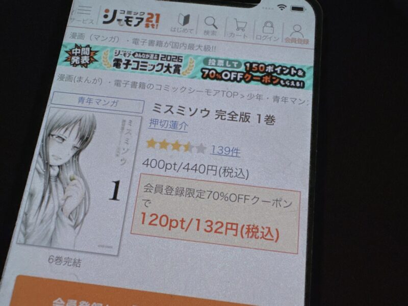 クーポンは6回使用できるため、全巻セット(2,640円)を複数回に分けて購入すれば、最大1,848円の割引を受けられます。