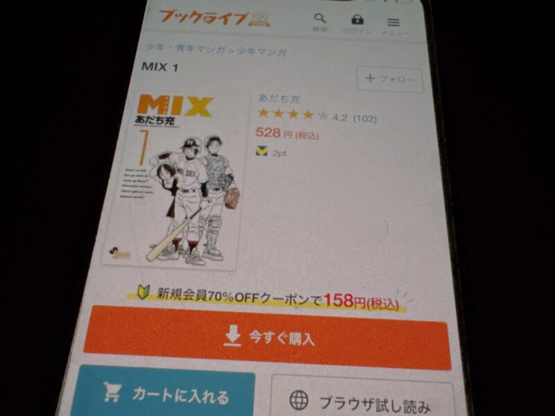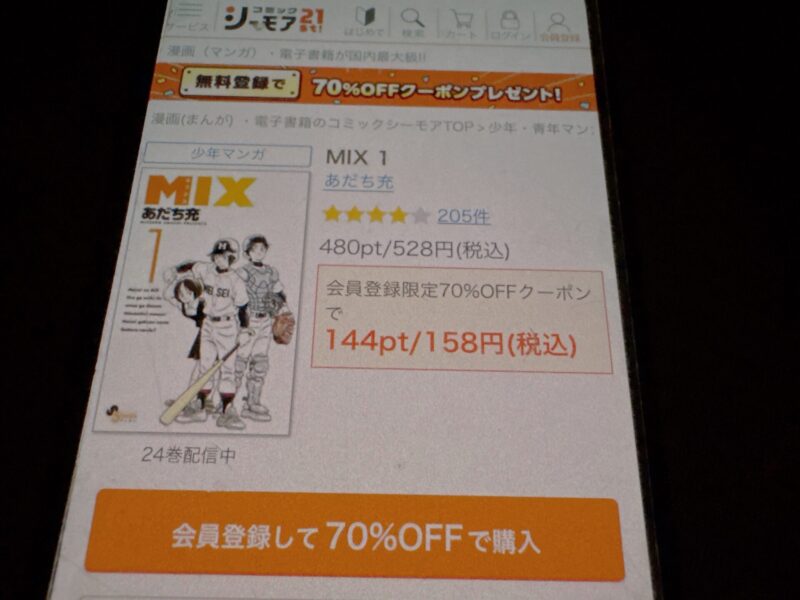 たとえばMIX1巻(税込528円)を購入する場合、クーポン利用で158円(税込)で購入できます。