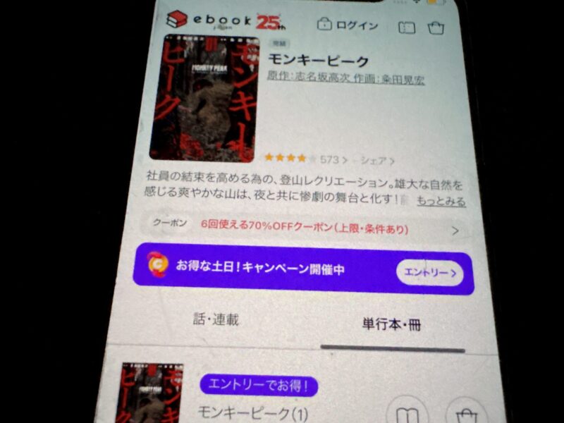 キャンペーンを利用すると、モンキーピークを割安にまとめて購入したり、1巻だけ無料で購入することが可能です。