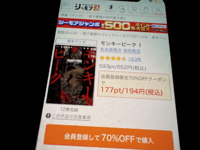 たとえばモンキーピーク1巻(税込652円)を購入する場合、クーポン利用で196円(税込)で購入できます。