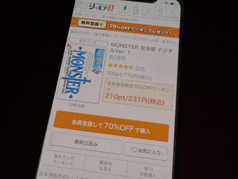 たとえばMONSTER 完全版1巻(税込770円)を購入する場合、クーポン利用で231円(税込)で購入できます。