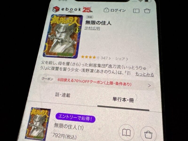 キャンペーンを利用すると、無限の住人を割安にまとめて購入したり、1巻だけ無料で購入することが可能です
