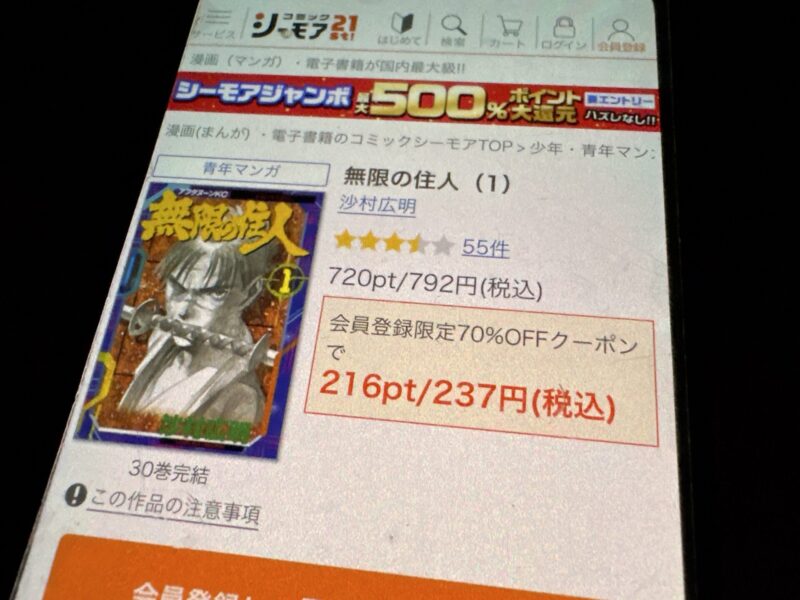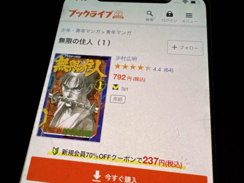 たとえば無限の住人1巻(税込792円)を購入する場合、クーポン利用で238円(税込)で購入できます。