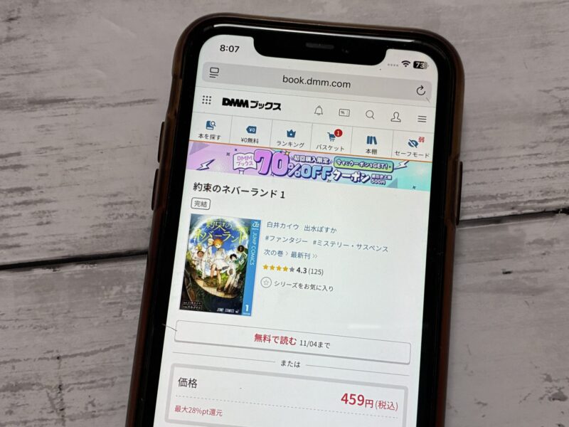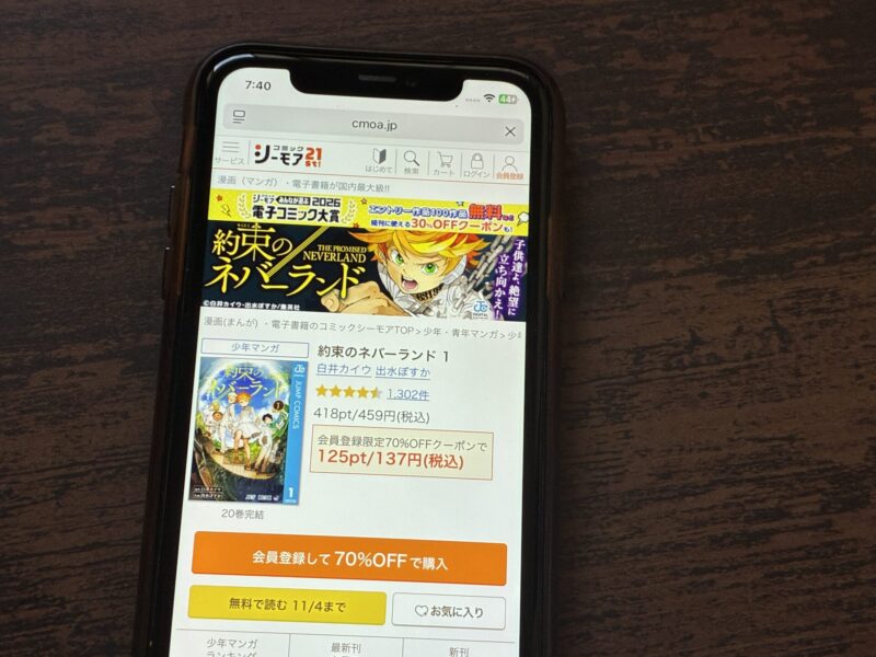 たとえば約束のネバーランド1巻(税込459円)を購入する場合、クーポン利用で138円(税込)で購入できます。