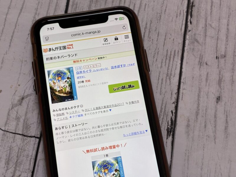 約束のネバーランドはまるごと無料では読めませんが、試し読みはできます。