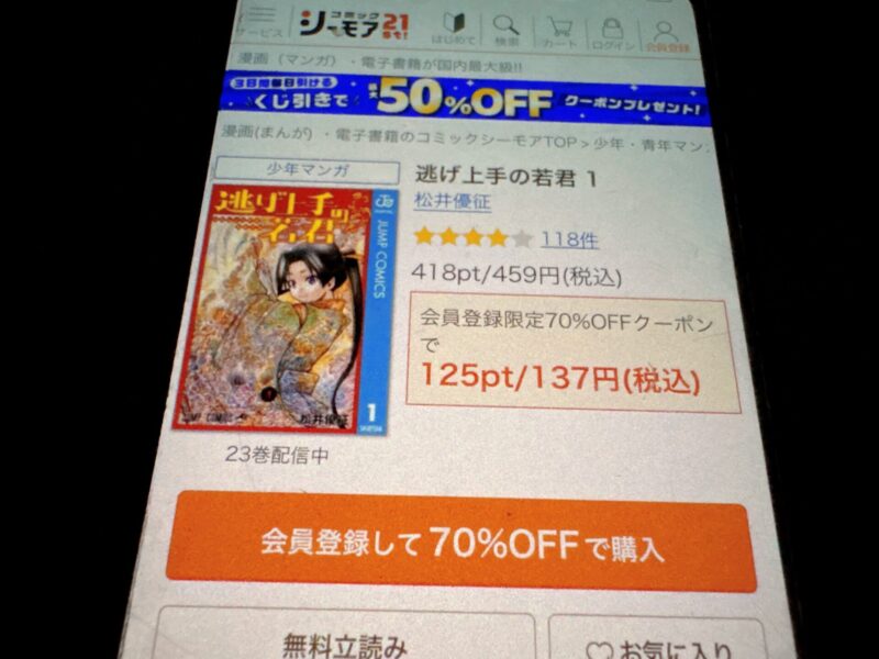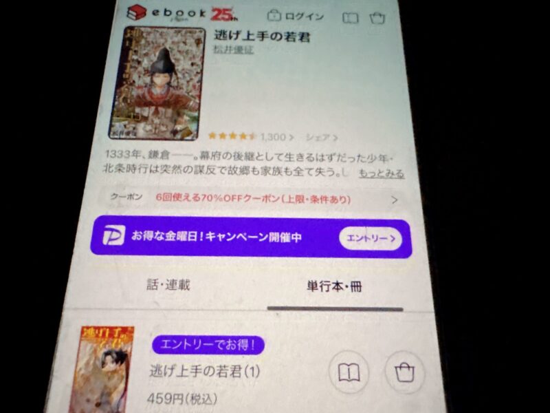 キャンペーンを利用すると、逃げ上手の若君を割安にまとめて購入したり、1巻だけ無料で購入することが可能です。