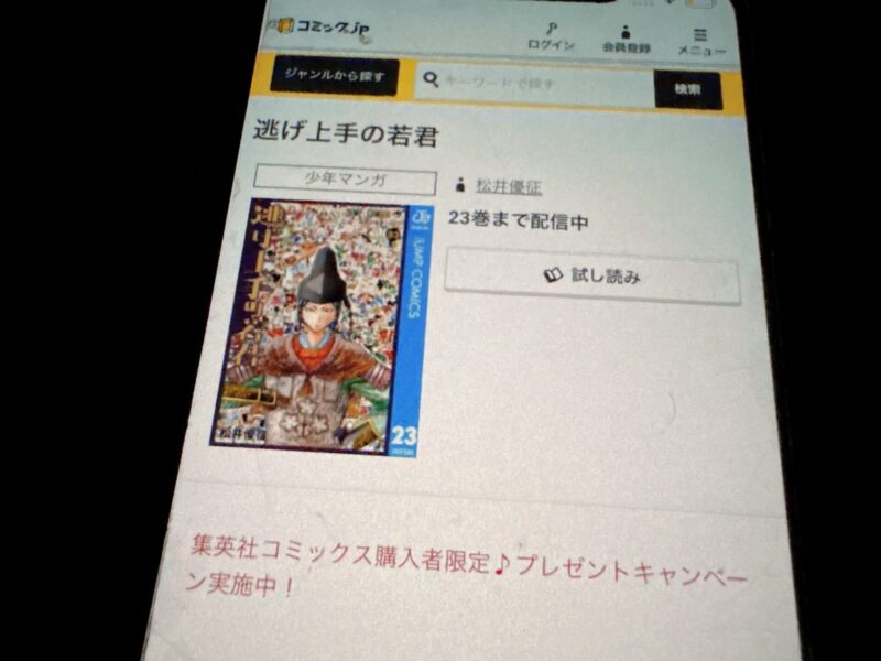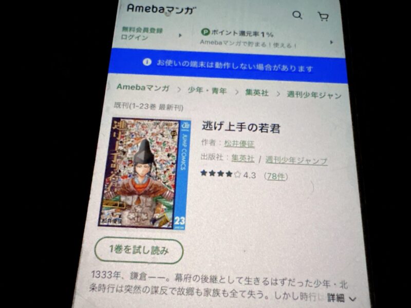 逃げ上手の若君はまるごと無料では読めませんが、1巻が無料で試し読みできるキャンペーンが随時行われています。