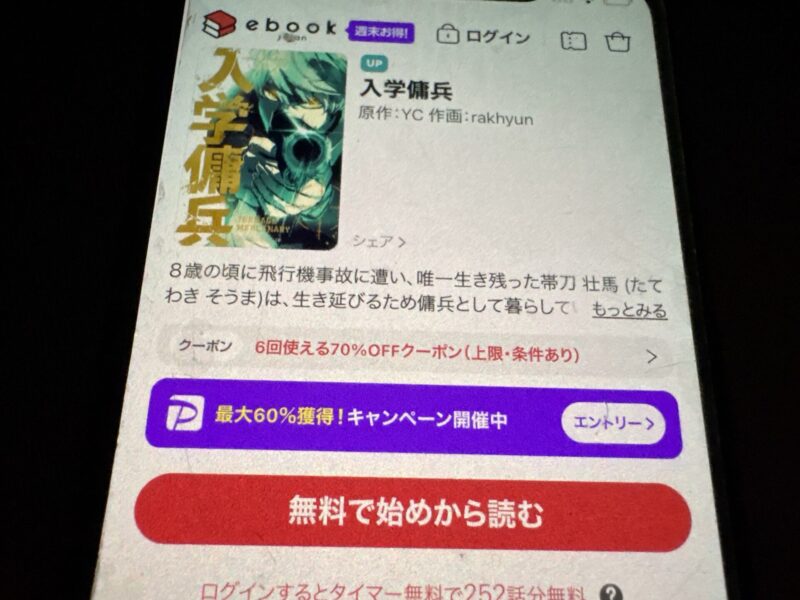 キャンペーンを利用することで一部の話は無料で読めるため、お得に入学傭兵を全話読むためには利用しましょう。