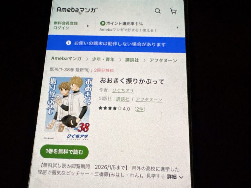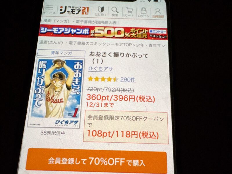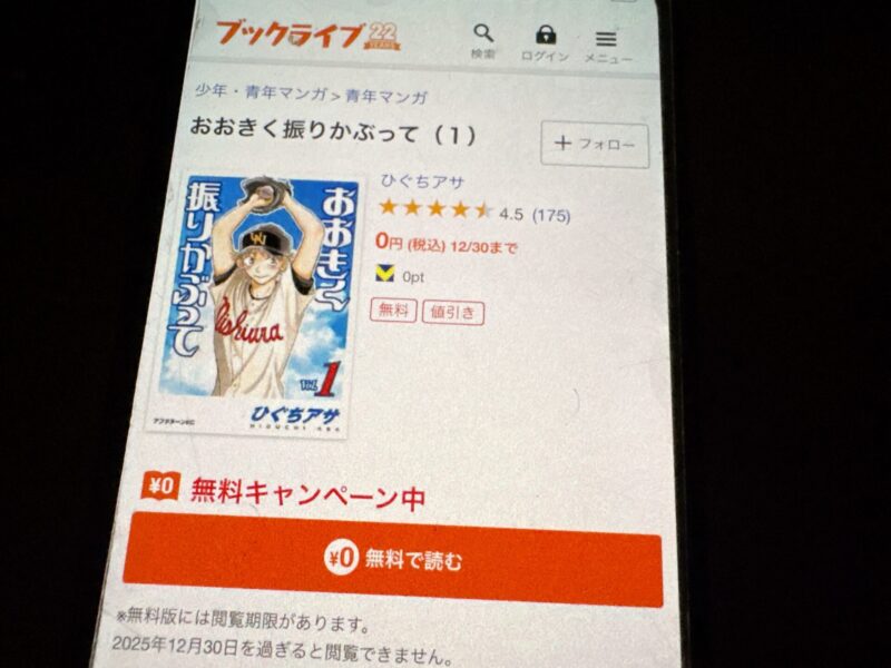 キャンペーンを利用すると、おおきく振りかぶってを割安にまとめて購入したり、1巻だけ無料で購入することが可能です