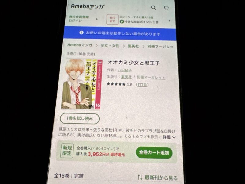 オオカミ少女と黒王子の場合、全16巻までを7,904ポイントで購入できます。