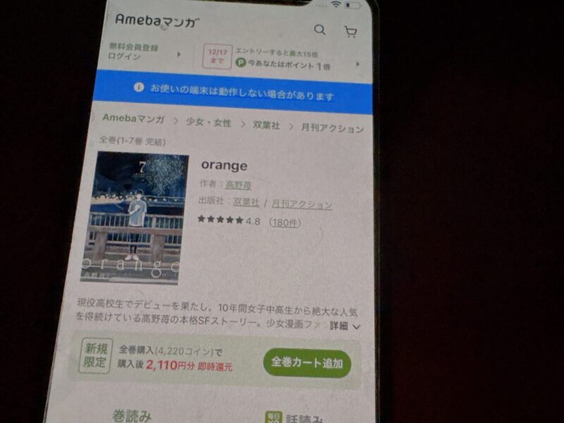 なお、orange全巻をできるだけ安く購入するには、5巻分を購入し、残りの巻を還元ポイントで購入する必要があります。