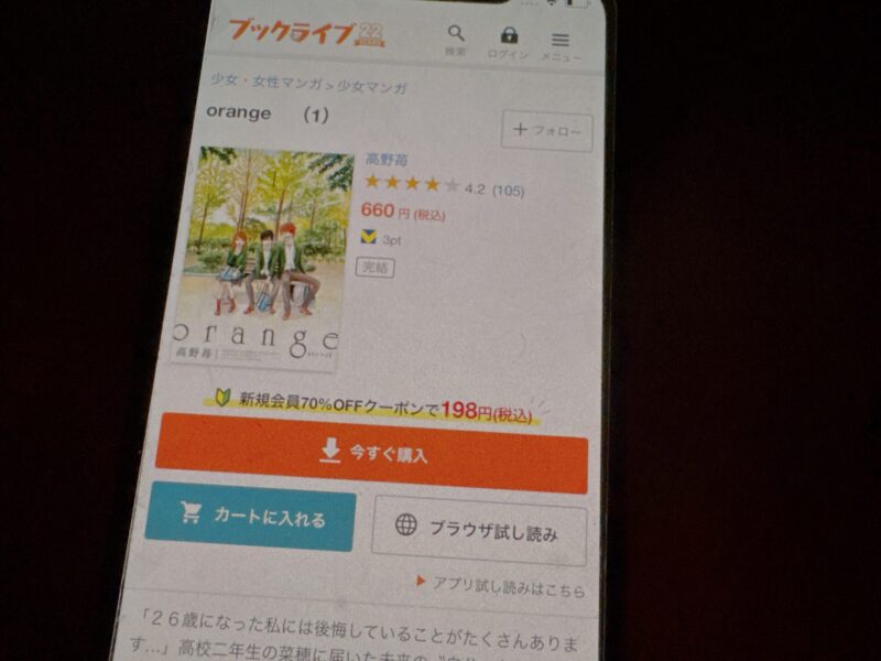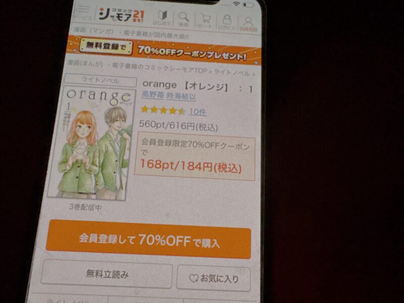 たとえばorange1巻(税込660円)を購入する場合、クーポン利用で198円(税込)で購入できます。