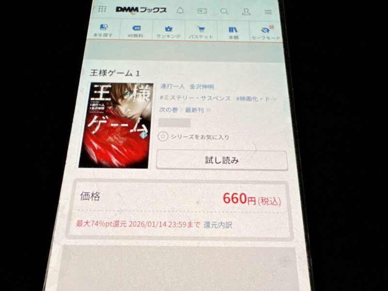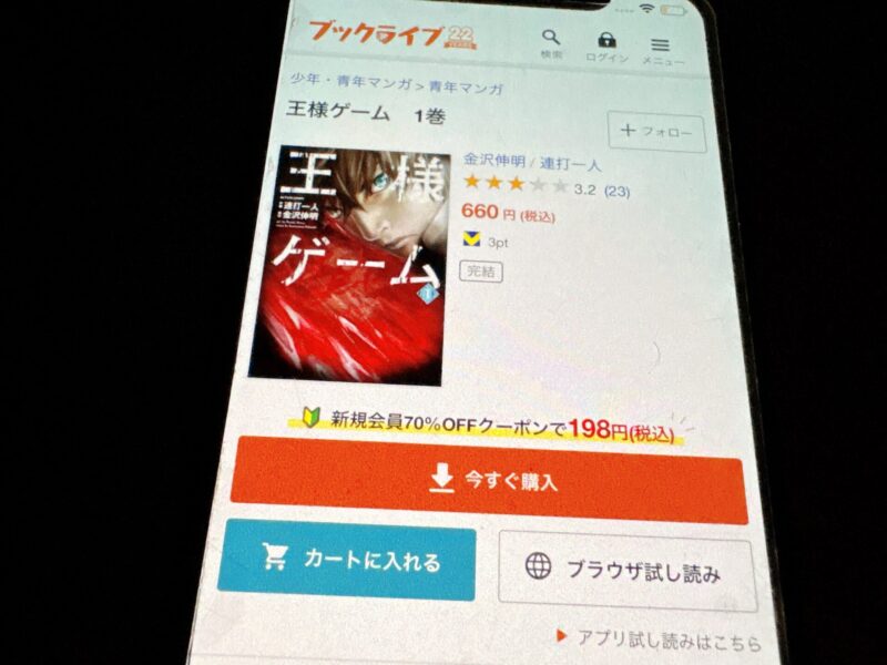 たとえば王様ゲーム1巻(税込660円)を購入する場合、クーポン利用で198円(税込)で購入できます。