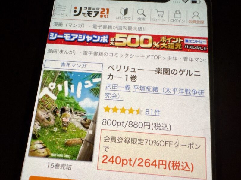 新規登録キャンペーンで「コミックシーモア3000」の申込みをすれば総獲得ポイントは7,380ポイントになるので、6,600円(2ヶ月分の料金)+1,420ポイントで「ペリリュー ─楽園のゲルニカ─」全巻を購入できる計算になり大変お得です。