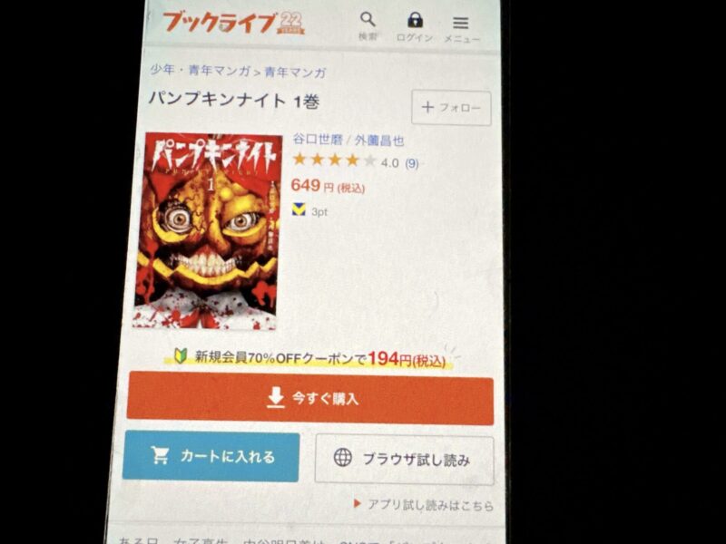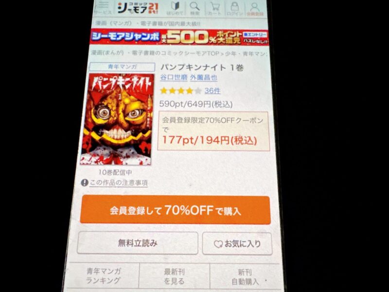 たとえばパンプキンナイト1巻(税込649円)を購入する場合、クーポン利用で195円(税込)で購入できます。