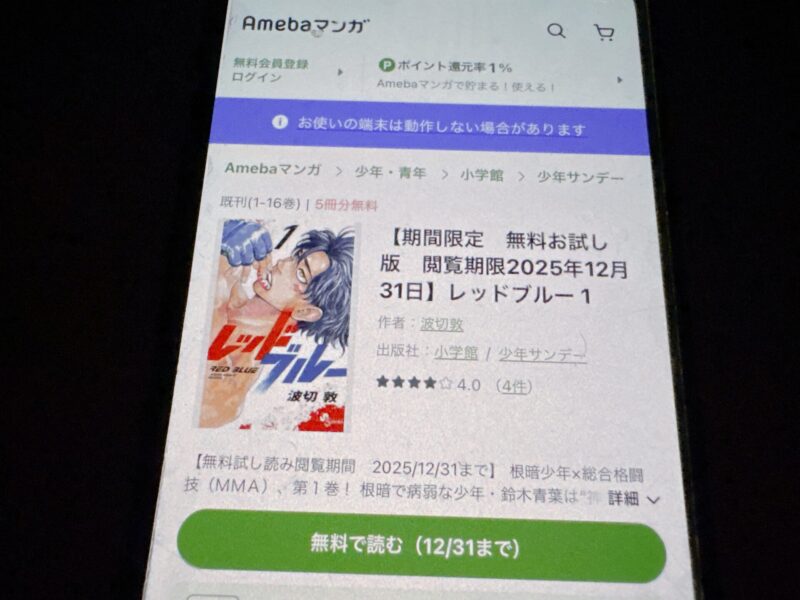 レッドブルーはまるごと無料では読めませんが、試し読みはできます。