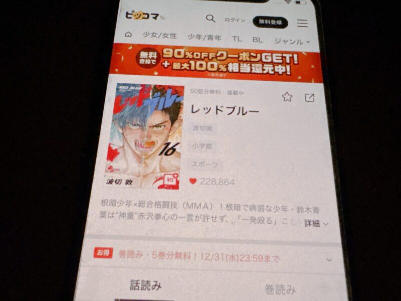 「ピッコマ」では、12/13(土)の23:59まで、レッドブルー5巻までを無料で読むことができます。