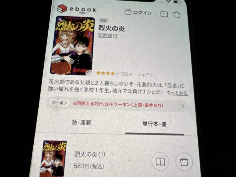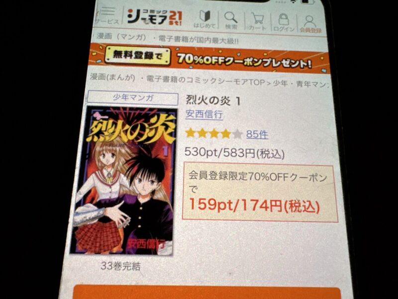 たとえば烈火の炎1巻(税込583円)を購入する場合、クーポン利用で175円(税込)で購入できます。