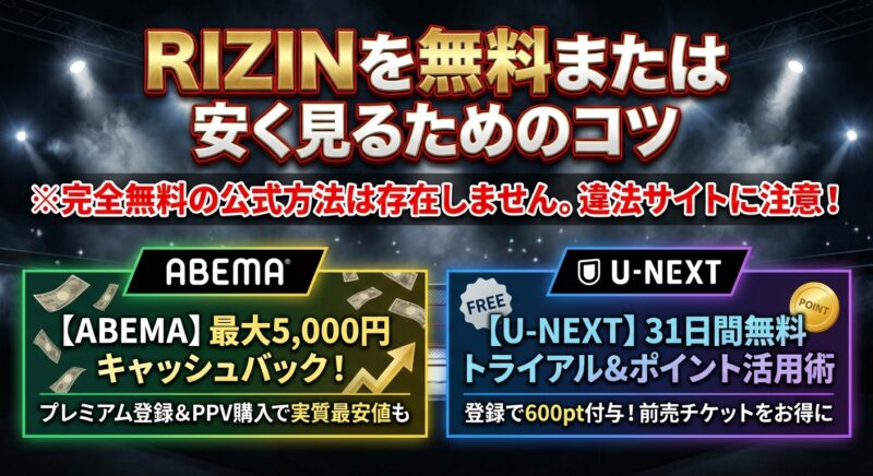 「RIZIN師走の超強者祭り」を少しでもお得に楽しみたい、というのが本音ですよね。完全に無料で視聴する方法は残念ながらありませんが、各配信サービスのキャンペーンや特典を賢く利用することで、実質的な負担を大きく減らすことが可能です。 ここでは、RIZINをできるだけ安く視聴するための具体的なコツを3つご紹介します。