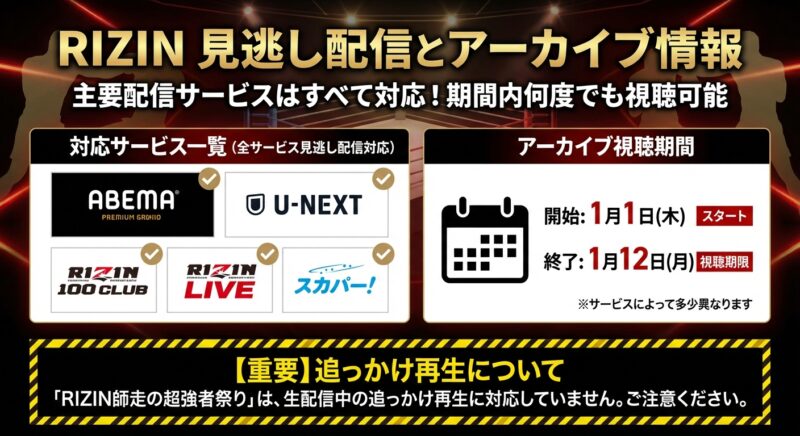 また、「ABEMA」や「U-NEXT」など一部のサービスには追っかけ再生機能がありますが、「RIZIN師走の超強者祭り」に関しては、生配信中の追っかけ再生に対応していません。