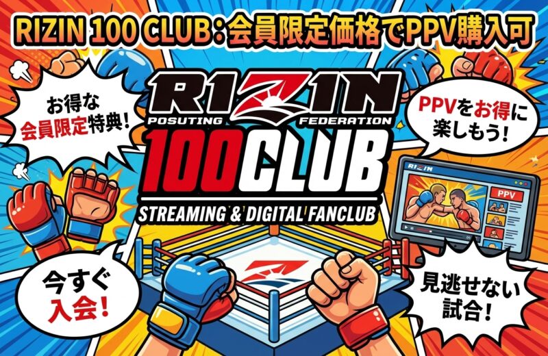 「RIZIN 100 CLUB」は、RIZIN公式が運営するファン向けの定額制動画配信サービスです。熱心なRIZINファンであれば、PPVの割引だけでなく、様々な限定コンテンツを楽しめるこのサービスは見逃せません。