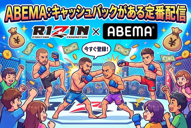 「ABEMA」は、RIZINの視聴方法として最も定番の選択肢の一つです。特に注目すべきは、大規模なキャッシュバックキャンペーンが実施されている点です。これをうまく活用すれば、実質的な負担を大きく減らしてPPV(ペイ・パー・ビュー)チケットを購入できます。コメント機能で他の視聴者と盛り上がれるのもABEMAならではの魅力です。