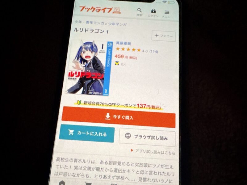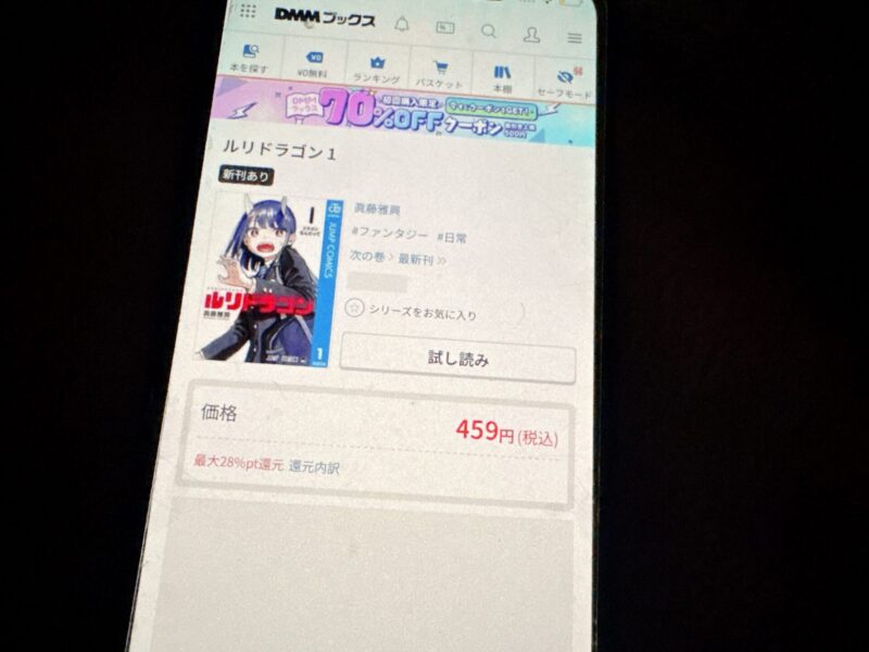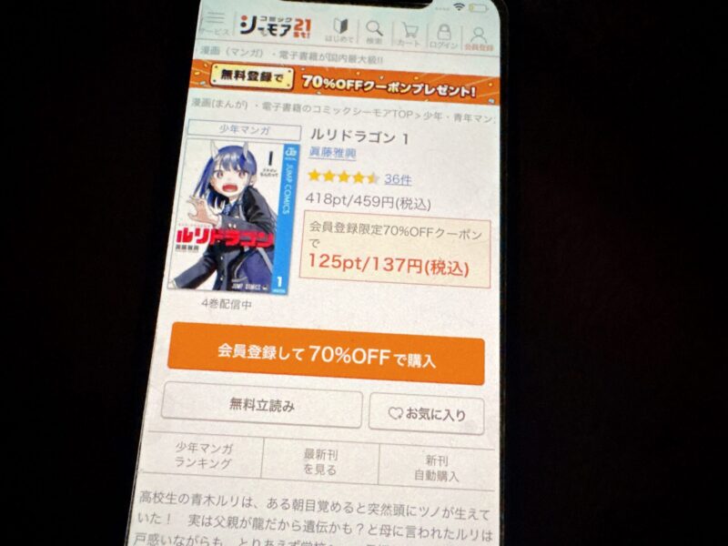 たとえばルリドラゴン1巻(税込459円)を購入する場合、クーポン利用で138円(税込)で購入できます。