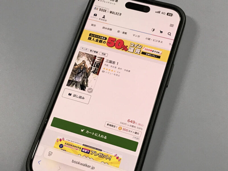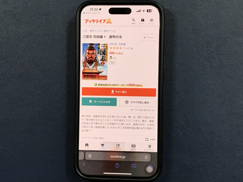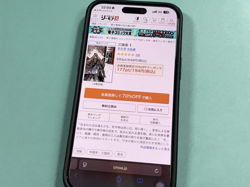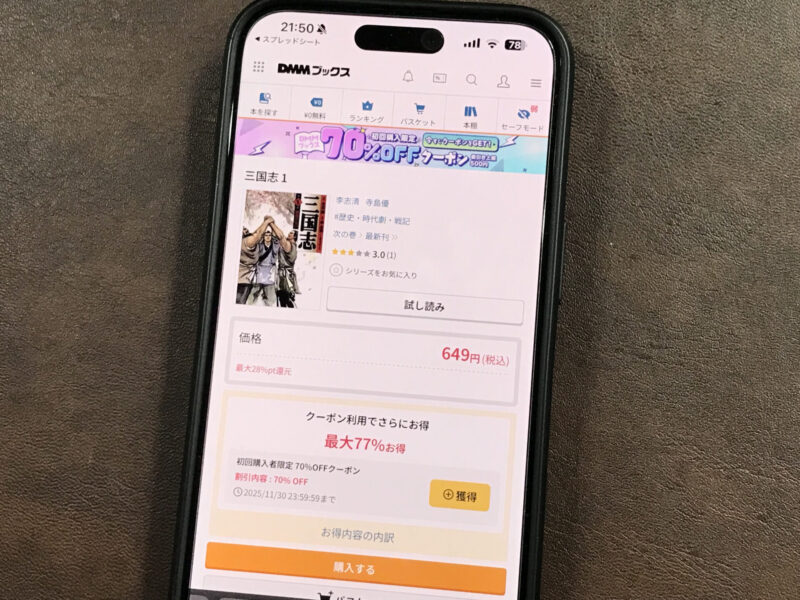 たとえば三国志1巻(税込649円)を購入する場合、クーポン利用で195円(税込)で購入できます。