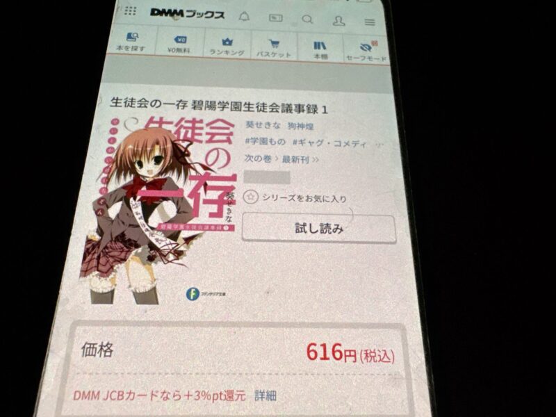 新規登録キャンペーンで「コミックシーモア2000(コース名)」の申込みをすれば総獲得ポイントは4900ポイントになるので、4400円(2ヶ月分の料金)で「生徒会の一存」全巻を購入できる計算になりお得です。