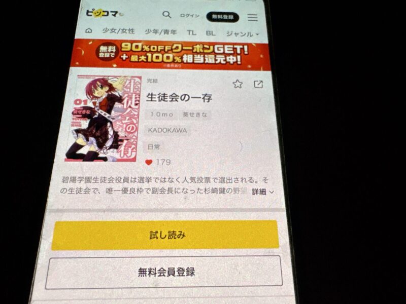 ピッコマでは、無料会員登録で90%OFFクーポン(割引上限1,000コイン)がもらえます。