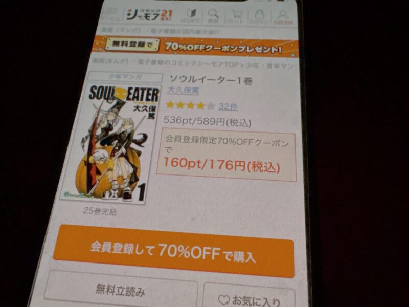 たとえばソウルイーター1巻(税込589円)を購入する場合、クーポン利用で177円(税込)で購入できます。
