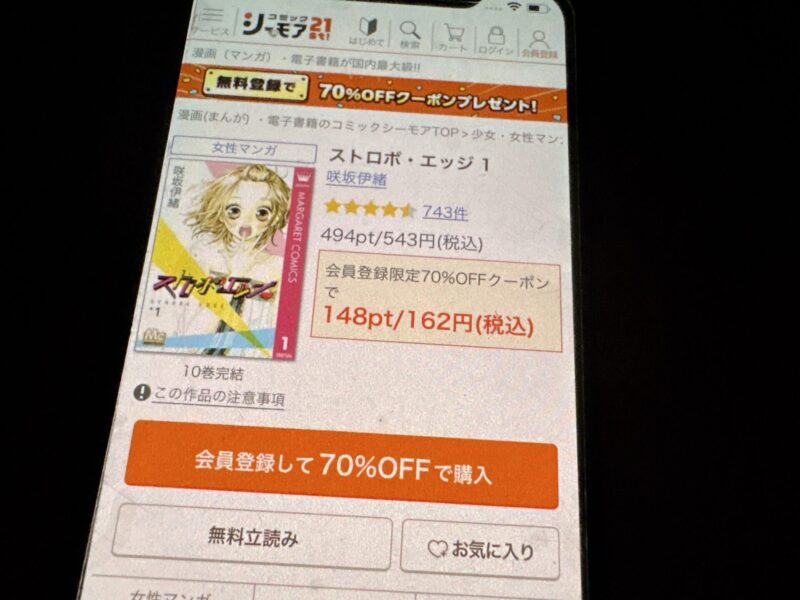 新規登録キャンペーンで「コミックシーモア3000」の申込みをすれば総獲得ポイントは7,380ポイントになるので、6,600円(2ヶ月分の料金)で「ストロボ・エッジ」全巻を購入できる計算になりお得です。