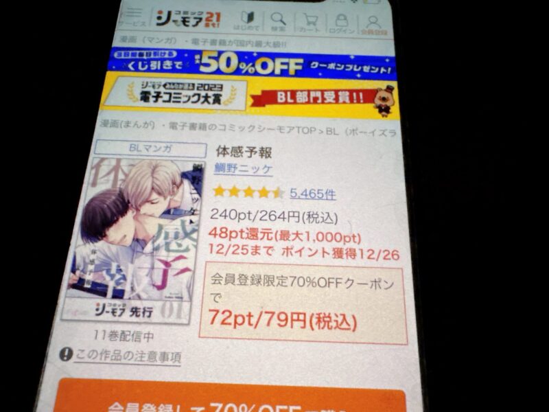 たとえば体感予報1巻(税込264円)を購入する場合、クーポン利用で79円(税込)で購入できます。