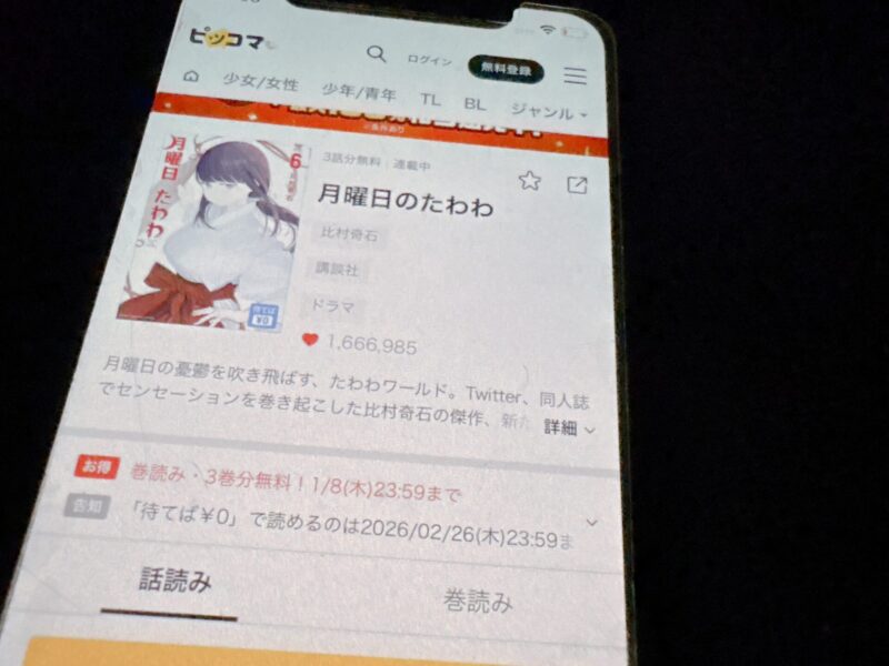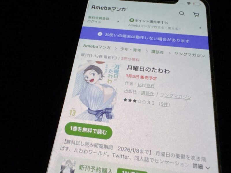 月曜日のたわわはまるごと無料では読めませんが、試し読みはできます。また、2025年12月18日までは1〜3巻が無料で読めるキャンペーンも実施中です。