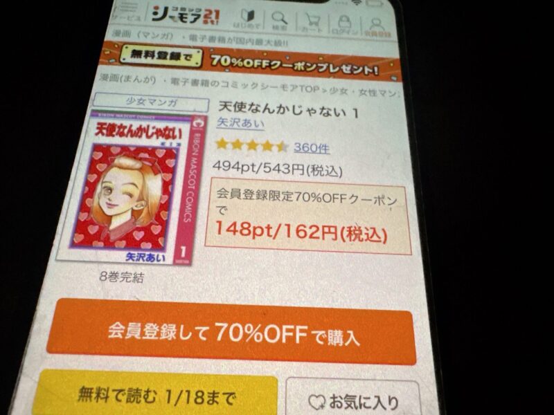 新規登録キャンペーンで「コミックシーモア3000」の申込みをすれば総獲得ポイントは7,380ポイントになるので、6,600円(2ヶ月分の料金)で「天使なんかじゃない」全巻を購入できる計算になりお得です。
