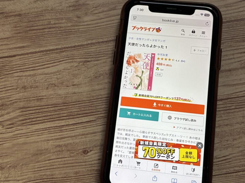 また、ブックライブは会員登録するだけで1冊限定の70%オフクーポンがもらえます。