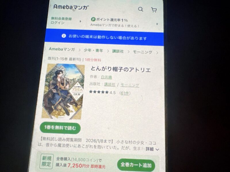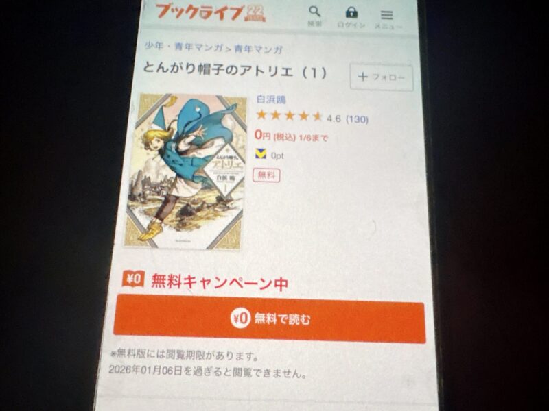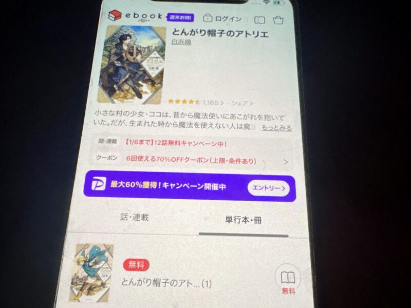 キャンペーンを利用すると、とんがり帽子のアトリエを割安にまとめて購入したり、1巻だけ無料で購入することが可能です。