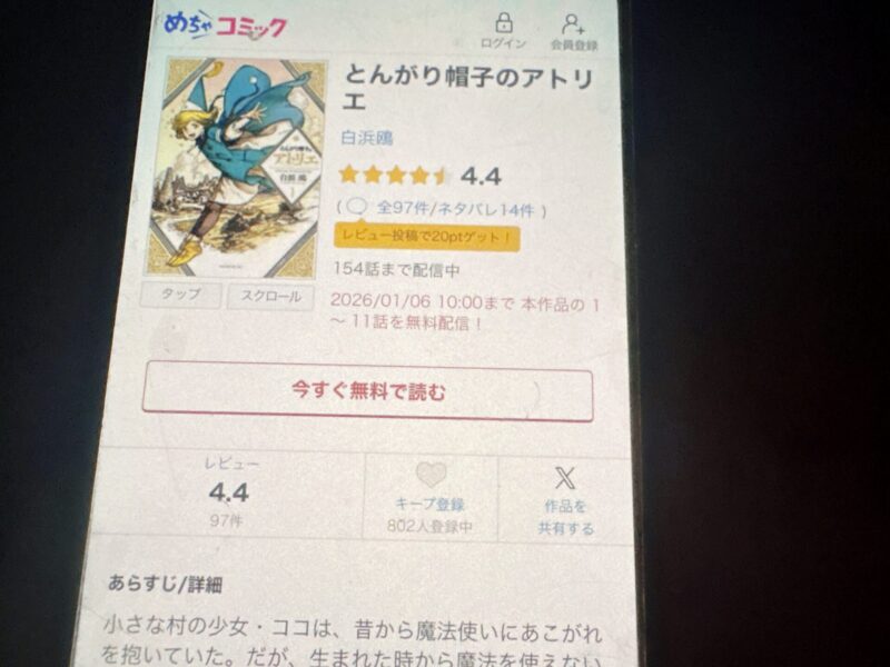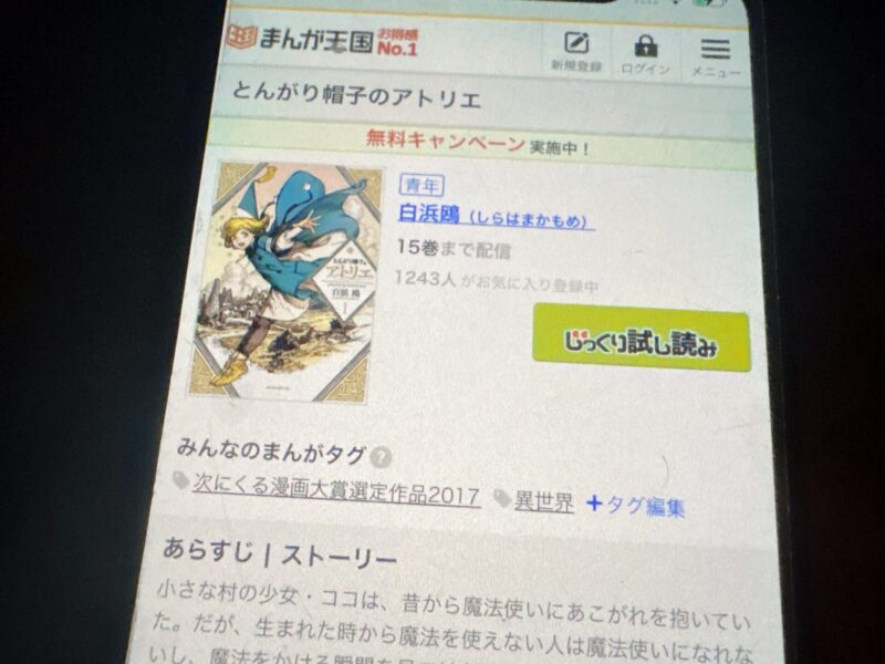 とんがり帽子のアトリエはまるごと無料では読めませんが、試し読みはできます。