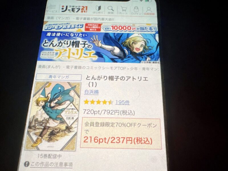 新規登録キャンペーンで「コミックシーモア10000(コース名)」の申込みをすれば総獲得ポイントは12,500ポイントになるので、11,000円(2ヶ月分の料金)で「とんがり帽子のアトリエ」全巻を購入できる計算になり大変お得です。