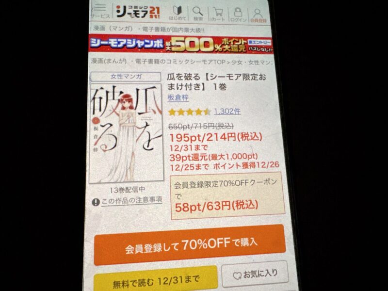 新規登録キャンペーンで「コミックシーモア10000」の申込みをすれば総獲得ポイントは25,000ポイントになるので、22,000円(2ヶ月分の料金)で「瓜を破る」全巻を購入できる計算になりお得です。