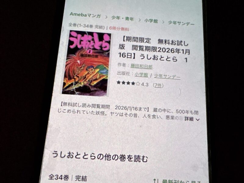 うしおととらは現在1~6巻が無料で読めますが、試し読みもできます。