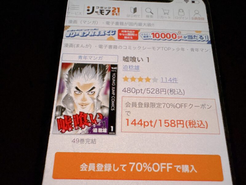 新規登録キャンペーンで「コミックシーモア20000」の申込みをすれば総獲得ポイントは26,000ポイントになるので、22,000円(2ヶ月分の料金)で「嘘喰い」全巻を購入できる計算になり大変お得です。