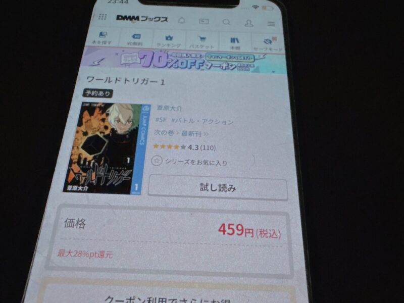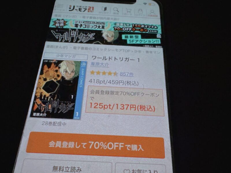 たとえばワールドトリガー1巻(税込459円)を購入する場合、クーポン利用で138円(税込)で購入できます。
