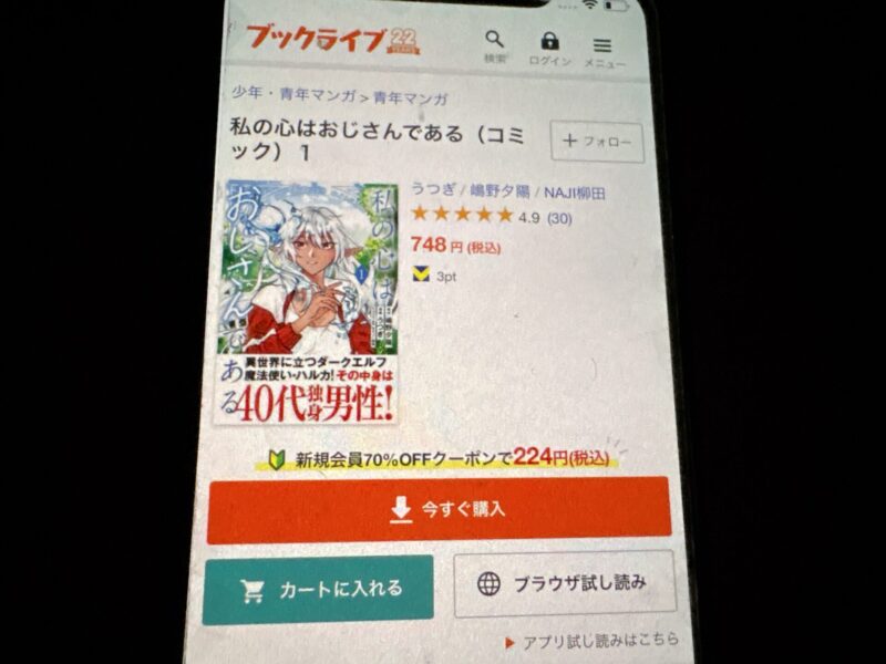 たとえば私の心はおじさんである1巻(税込748円)を購入する場合、クーポン利用で224円(税込)で購入できます。