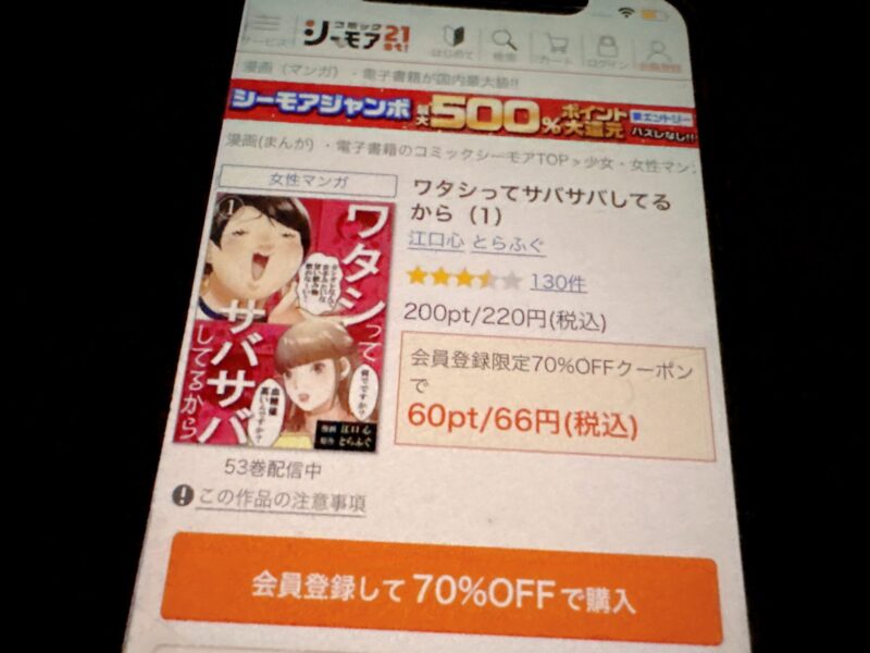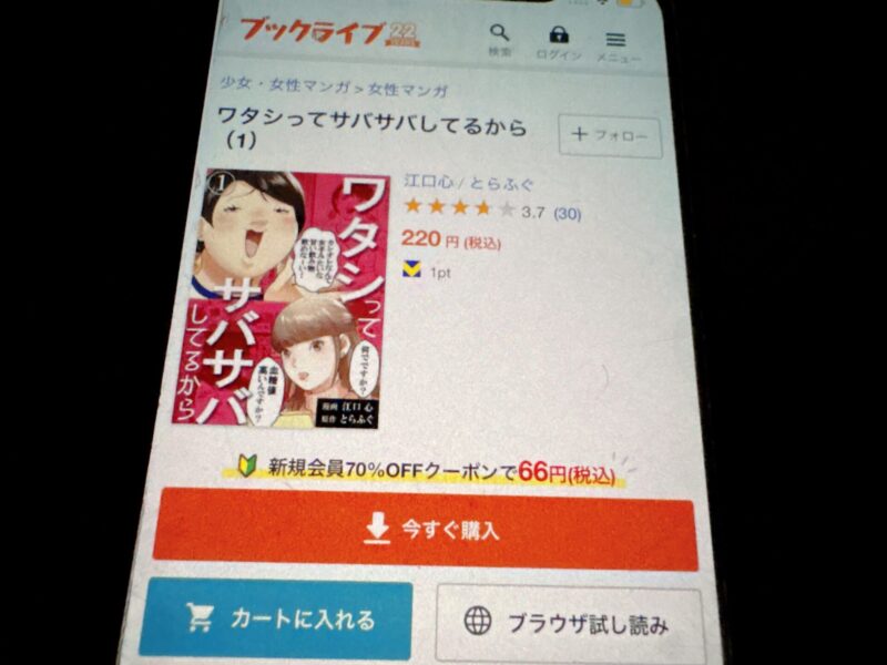 たとえばワタシってサバサバしてるから1巻(税込220円)を購入する場合、クーポン利用で66円(税込)で購入できます。