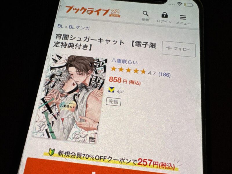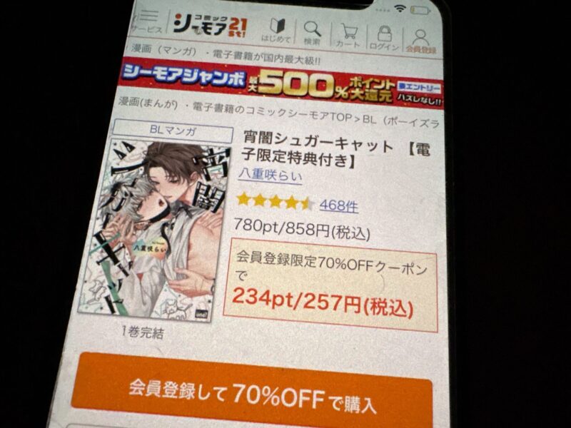 たとえば宵闇シュガーキャット1巻(税込858円)を購入する場合、クーポン利用で257円(税込)で購入できます。