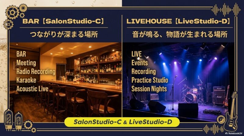 - 構成:BAR「SalonStudio-C」Cスタ / ライブハウス「LiveStudio-D」Dスタ